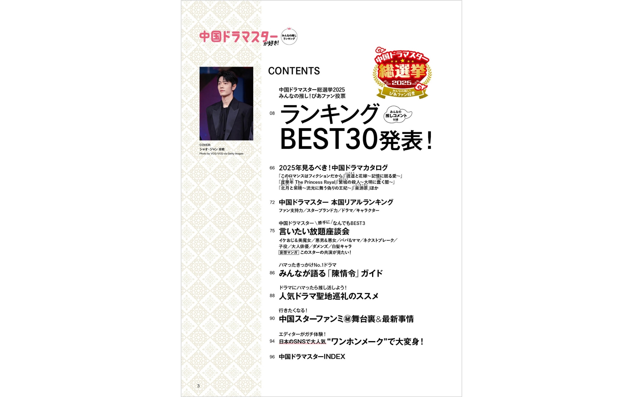 時代劇から現代劇までさまざまなジャンルの作品で活躍する中国ドラマスターたちは、日本でも多くのファンを生んで人気急上昇中! そんなスターたちの魅力をたっぷりとお届けする本誌では、ぴあ(アプリ)で実施のリアル投票企画『中国ドラマスター総選挙2025 みんなの推し!ぴあファン投票』の最終結果を公開します。