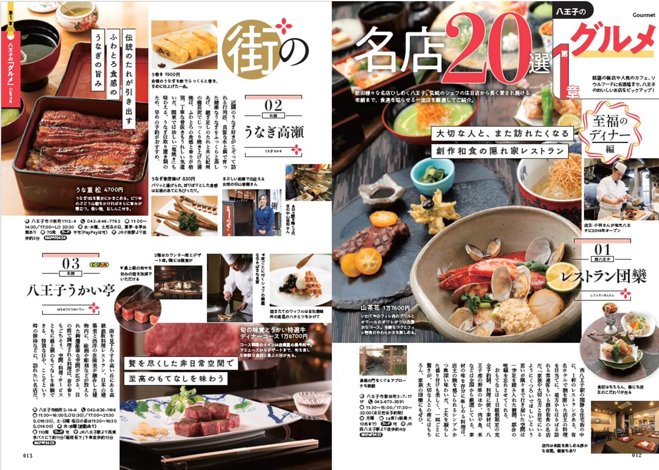 街の名店20選/至福のディナー編/名物ランチ編/カレーの名店/非日常の個性派カフェ/ソウルフード/八王子ラーメン/八王子ナポリタン/都まんじゅう/パンカツ街そば&うどん/地元で人気の街角ベーカリー/通いたくなる名酒場/一度は食べたい絶品スイーツ/てっぱんみやげセレクション