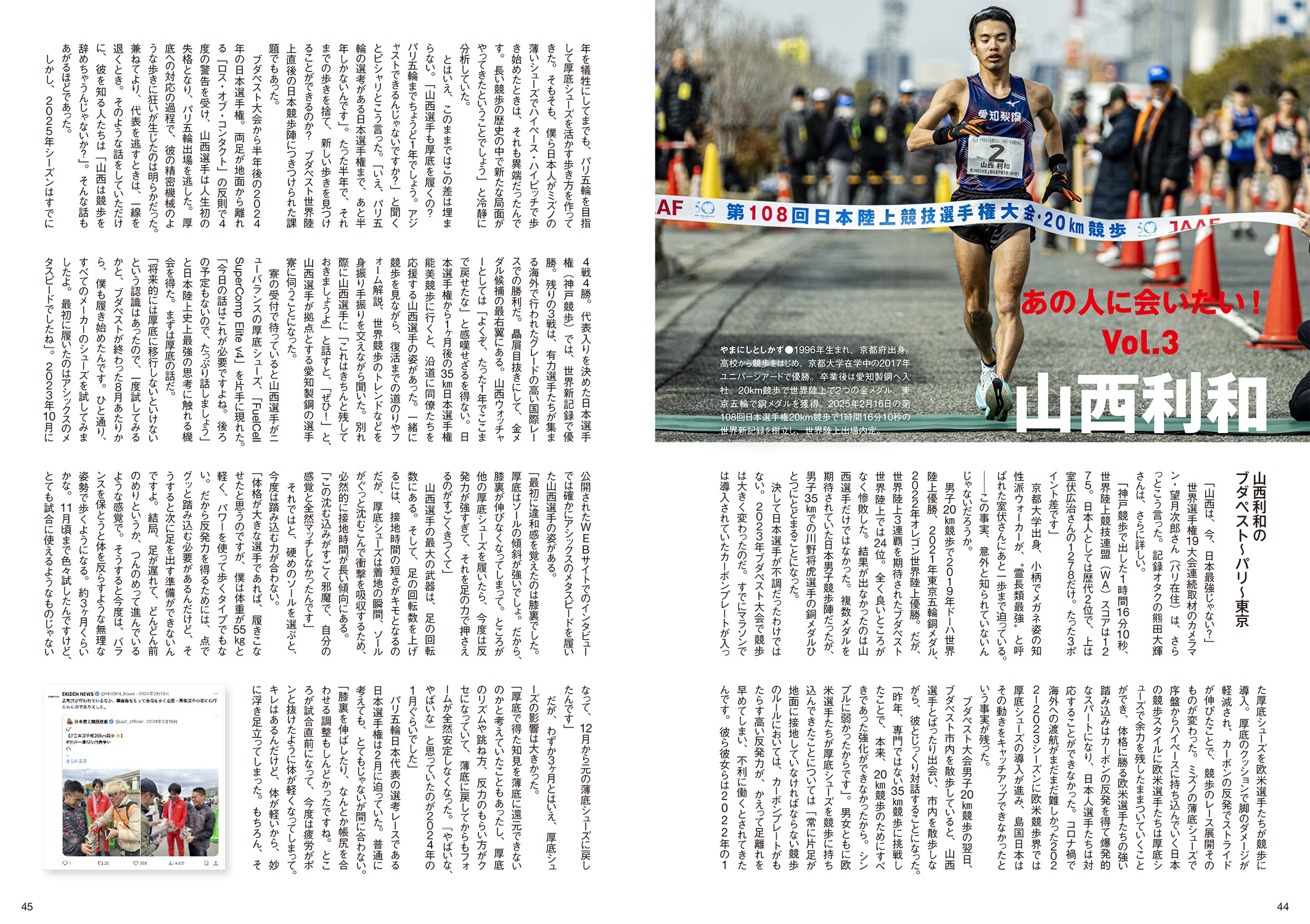 <世界陸上版・巻頭言です!> 隣で「こりゃ、すごいな!」と感嘆していたのは、当時の駒澤大学陸上競技部監督・大八木弘明さん。2022年オレゴン世界陸上にまだ駒澤大学の学生だった田澤廉を10000m日本代表へと送り出し、さらに男子10000m決勝の直前に行われた男子マラソンには、教え子だった西山雄介も出場。オレゴン・ヘイワード・フィールドに入ると「おーい! こっちこっち!」と声をかけられ、大八木さんの隣で男子10000mを観ることになった。大八木さんは1991年の東京世界陸上で、男子1500mの奥山光広さん(現ヤクルト・チーフアドバイザー)のコーチとして帯同していたはずだ。ほかにも大八木さんの教え子たちはこれまでも世界陸上に多数出場している。ただ、現役大学生が出場するのは、駒澤大では田澤がおそらく初めて。世界大会の時期は大学駅伝に向けた夏合宿の時期にも重なるため、監督業を務めているときは現場に出ることは叶わなかった。つまり、かなり久しぶりの世界陸上の現場であった。隣で大八木さんは選手の一挙手一投足に「すげえな!」と反応している。「ああ、これが陸上人の感性なんだな」と素直に尊敬した。大八木さんが手を叩いて喜んでいたのは男子10000mではなかった。専門でもなく、選手の名前すら知らなかったはずの女子ハンマー投の予選──その豪快な一投一投に、大八木さんは目を奪われていたのだ。このときの「世界ってすごいな」という大八木さんの素直な驚きこそが、後に〝日本人選手が長距離種目において世界のトップを獲る〟というGgoat構想へとつながる起点になったのかもしれない。そんな世界の空気を、日本にいながらにして味わえる機会が──いよいよやってくる。あっ。申し遅れました。私、EKIDEN NEWSの西本と申します。ご覧の通り、屋号に〝駅伝〟とつく媒体を運営しておりますが、当初は箱根駅伝をはじめとした大学駅伝を追いかけているうちに、選手たちが大学を卒業してステップアップしていくもんですから、そのまま追いかけ続け、日本選手権へ。気づいたら駅伝だけでなく、陸上競技全般を追い続け、ダイヤモンドリーグ、世界陸上、オリンピックと「陸上があるならどこまでも」という人生となってしまいました。思い返せば2015年の春。「いま、会社を辞めたら北京世界陸上全日程行けるな」とふと頭をよぎったのがきっかけではありましたが、会社を辞めた10年後、まさか世界陸上が東京にやってくるなんて! この本が発売されるのは2025年の8月であります。東京世界陸上に出場する選手たちは最後の調整に入っているはず。私も単身、ヨーロッパに飛び、1ヶ月かけて東京世界陸上に出場するであろう選手を取材して東京に臨むつもり。つまり、選手同様、私も〝眼(まなこ)を仕上げて〟母国開催の世界陸上に臨むのであります。2015年の北京大会から、2017年ロンドン、2019年ドーハ、2022年オレゴン、2023年ブダペストと、5大会全日程駆け抜けておりますが、現地での興奮をSNSで伝えようとしても、時差もあって、日本国民にはなかなか伝わらない。ブダペスト世界陸上で田中希実が女子5000m14分37秒98の日本記録を達成したとき、この偉業を伝えたいと、記事を作ってEKIDEN NEWSのフォロワーたちに一斉DMを配信したところ。日本は深夜で「何時だと思ってるんだ! いい加減にしろ!」と怒られる始末(その2週間後に彼女は14分29秒18と更に日本記録を更新しましたが、怒られるのはいやなので一斉DMはやめました笑)。思い起こせば──私と世界陸上との10年は、「時差」との戦いでもありました。現地での興奮を共有したくとも、日本の生活リズムと合わないので、なかなか伝わらない。正直、私も現地に行くようになるまでは、翌朝起きて、ニュースやSNSで結果を知るくらいで十分でしたので、その気持ちはわかるのです。しかし、今回はEKIDEN NEWS史上初の「時差なし世界陸上」。現地で、テレビで、インターネットで、みなさんと同時にその興奮を共有できるのです。この写真は、やり投の北口榛花がブダペスト世界陸上、最終投擲で金メダルを決めた瞬間のもの。写真を見てわかる通り、このとき、私は北口の真後ろに待機。その全投擲を見続けておりました。このときの映像が後に何度も流れることとなり、その都度「あんたテレビに出てるで」と報告が入るようになりました。今回の東京世界陸上では、ブダペスト大会のこのシーンが上書きされるような名場面に出くわすことをとても楽しみにしています。最初の話に戻りましょう。世界のトップオブトップが集まる東京世界陸上のような大会は、前述の大八木さんのように、たとえ選手や競技に詳しくなくとも、素直に「すげえな」と楽しめるものなのです。ぜひ、今回の東京世界陸上だけは多少無理をしてでも、一度は現地で観戦することをおすすめします。次に東京にやってくるのは、おそらく……かなり先の話です。 最後に──東京世界陸上に出場するすべての選手が、最高のパフォーマンスを出せますよ