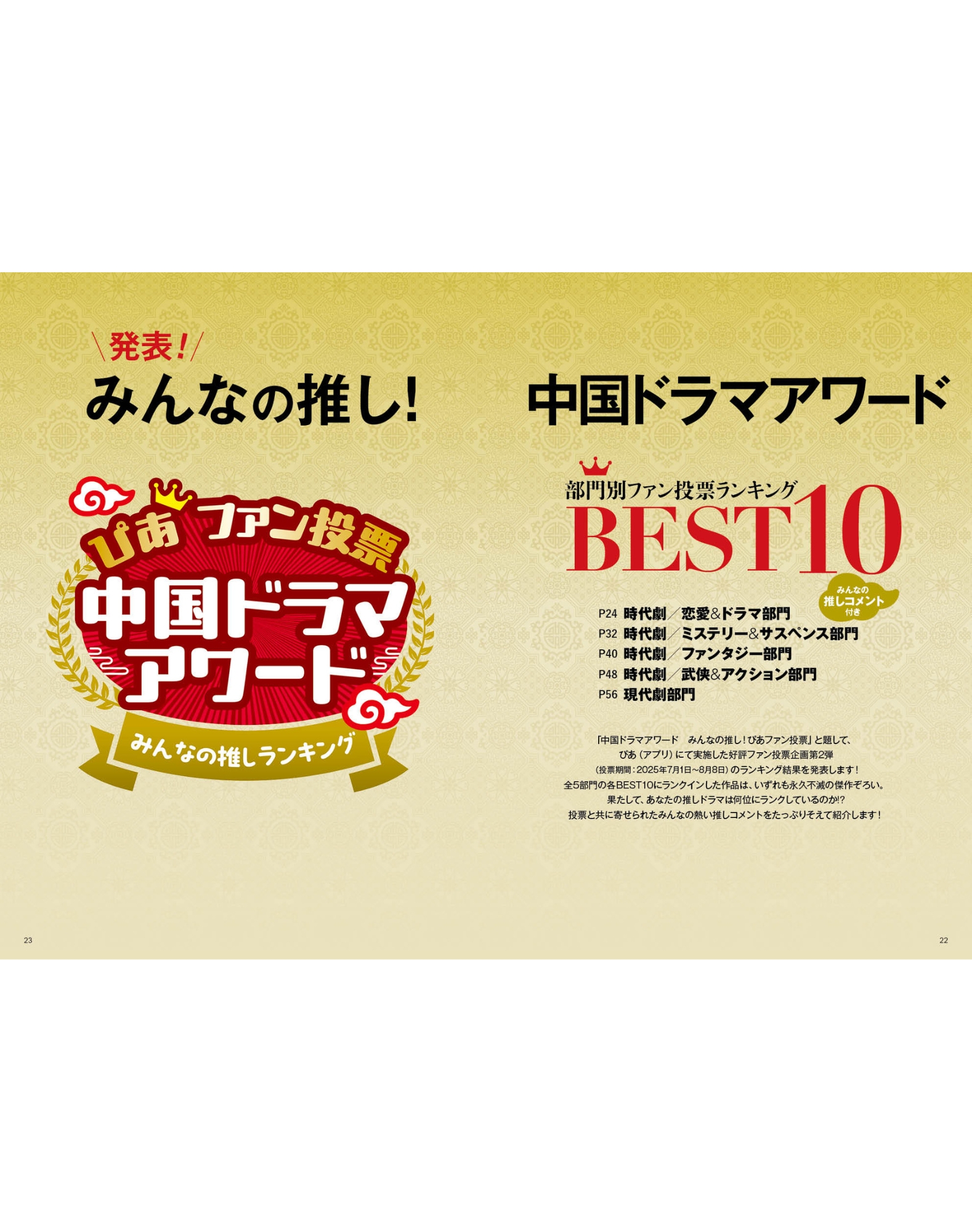 はたして、どんなランキングになるか!?最終結果は「中国ドラマが好き!みんなの推しドラマアワード」の誌面をご確認ください!