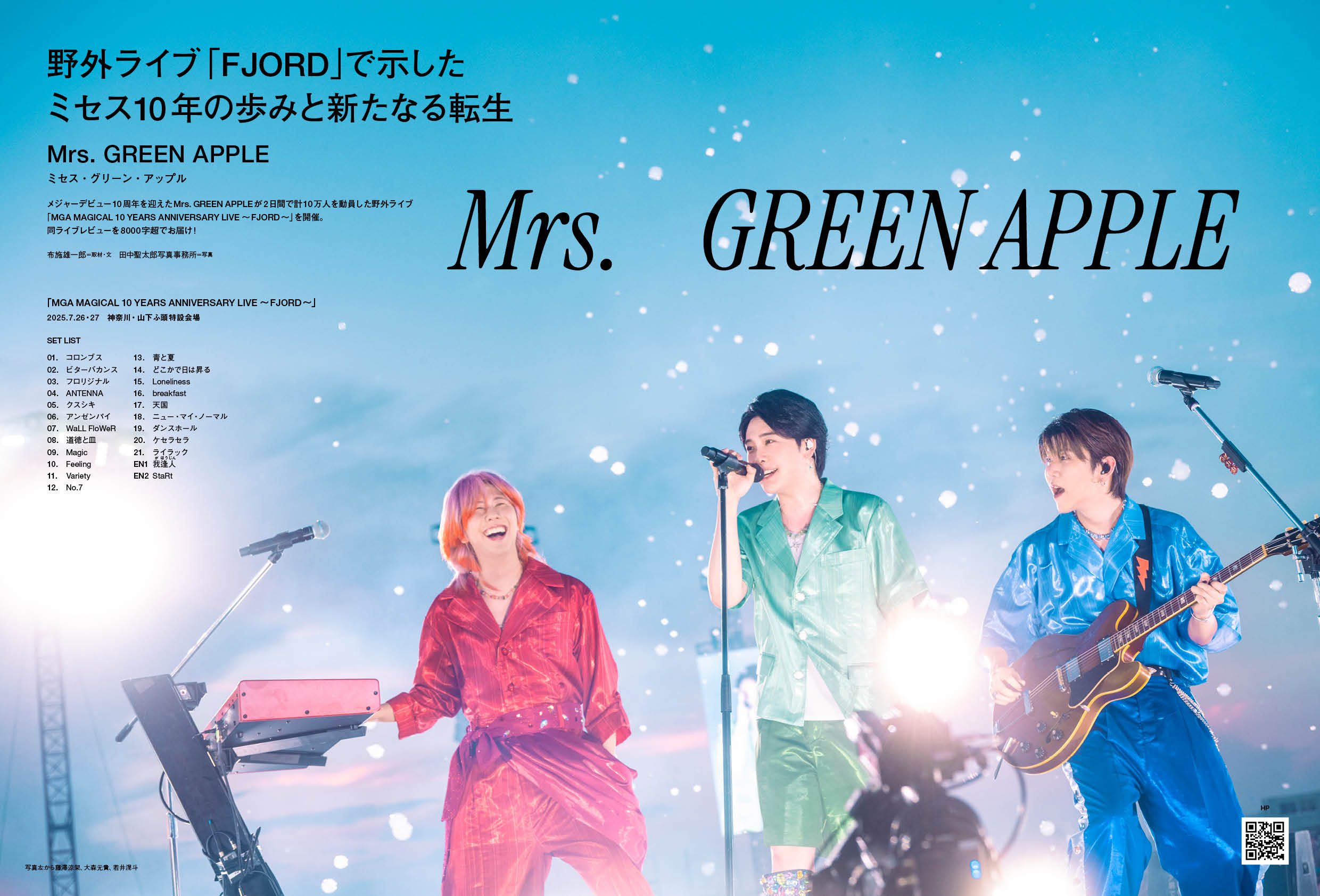 今号は、大規模なライブのレポートも充実。まずは、2日間で10万人を動員したMrs. GREEN APPLEの「MGA MAGICAL 10 YEARS ANNIVERSARY LIVE~FJORD~」。神奈川・山下ふ頭特設会場で繰り広げられた圧巻のエンタテインメントショーを8000字超でレポート。続いて、結成20周年のONE OK ROCK「DETOX JAPAN TOUR 2025」より8月31日、神奈川・日産スタジアム公演を。4月からスタートした北米・南米ツアーを経て日本に凱旋。大分公演を皮切りに、初のスタジアムツアー展開中の4人が、アクシデントに見舞われながらも、最後までやり切った渾身のライブを完全レポートする。そして、8月30・31日、神奈川・Kアリーナ横浜で開催された「聖飢魔Ⅱ vs BABYMETAL~悪魔が来りてベビメタる~」。地球デビュー40周年を迎えた貫禄の聖飢魔Ⅱと世界的な人気を誇るBABYMETALによる世紀の対バンの模様を届ける。メタルシーンの新伝説誕生となった2DAYSをご堪能ください。