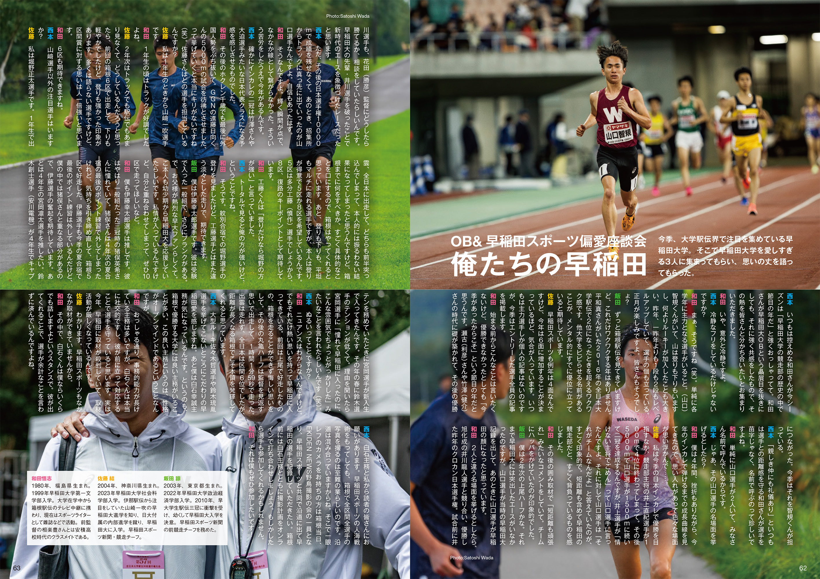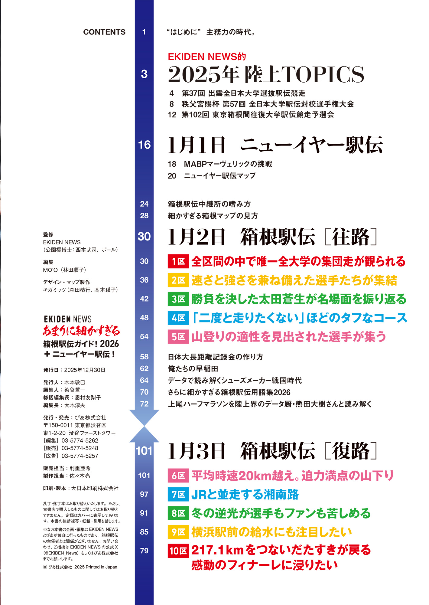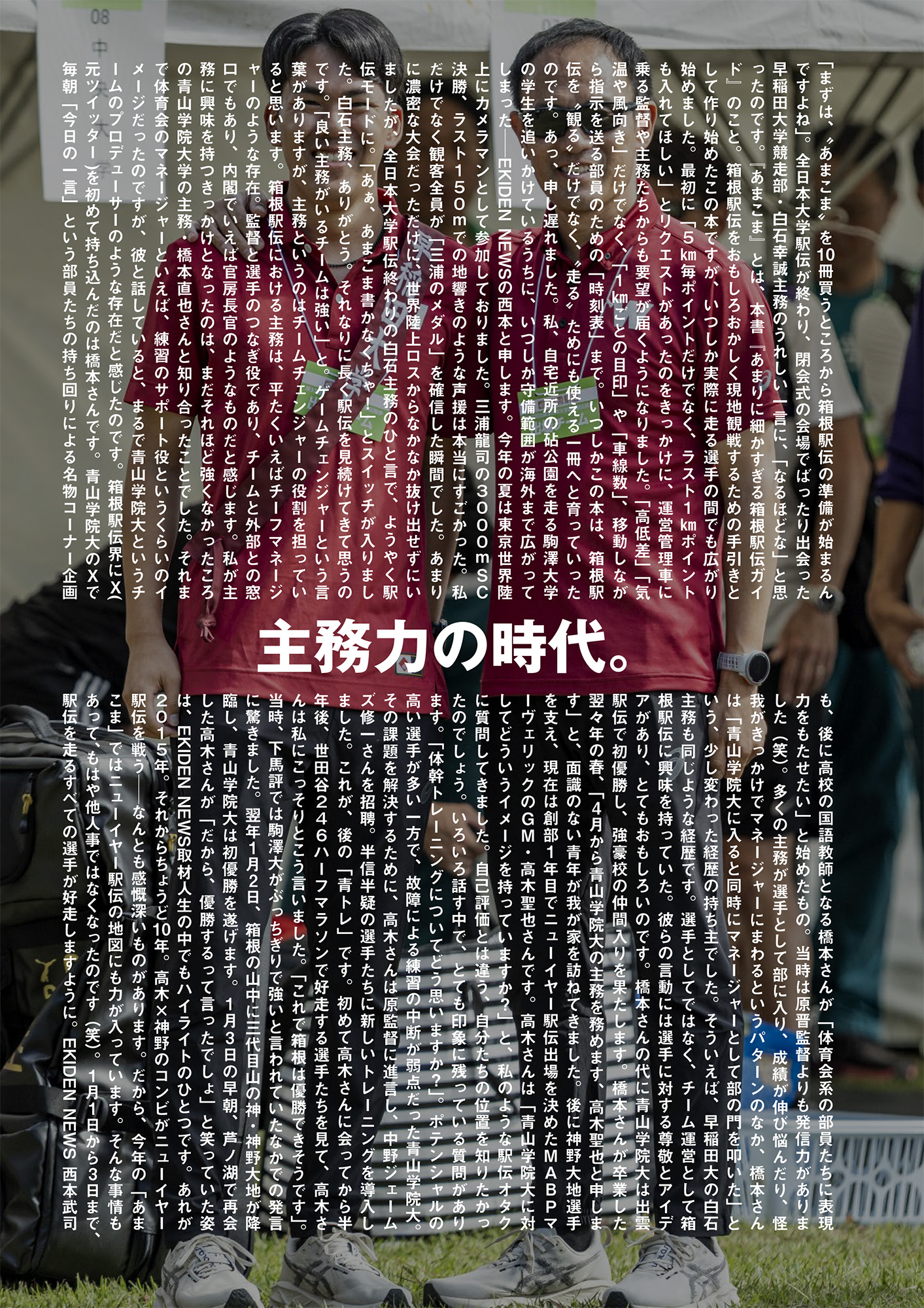《 恒例の巻頭言です! 》 主務力の時代。 「まずは、〝あまこま〟を10冊買うところから箱根駅伝の準備が始まるんですよね」。全日本大学駅伝が終わり、閉会式の会場でばったり出会った早稲田大学競走部・白石幸誠主務のうれしい一言に、「なるほどな」と思ったのです。『あまこま』とは、本書『あまりに細かすぎる箱根駅伝ガイド』のこと。箱根駅伝をおもしろおかしく現地観戦するための手引きとして作り始めたこの本ですが、いつしか実際に走る選手の間でも広がり始めました。最初に「5㎞毎ポイントだけでなく、ラスト1㎞ポイントも入れてほしい」とリクエストがあったのをきっかけに、運営管理車に乗る監督や主務たちからも要望が届くようになりました。「高低差」「気温や風向き」だけでなく、「1㎞ごとの目印」や「車線数」、移動しながら指示を送る部員のための「時刻表」まで。いつしかこの本は、箱根駅伝を〝観る〟だけでなく、〝走る〟ためにも使える一冊へと育っていったのです。あっ、申し遅れました。私、自宅近所の砧公園を走る駒澤大学の学生を追いかけているうちに、いつしか守備範囲が海外まで広がってしまった──EKIDEN NEWSの西本と申します。今年の夏は東京世界陸上にカメラマンとして参加しておりました。三浦龍司の3000mSC決勝、ラスト150mでの地響きのような声援は本当にすごかった。私だけでなく観客全員が「三浦のメダル」を確信した瞬間でした。あまりに濃密な大会だっただけに、世界陸上ロスからなかなか抜け出せずにいましたが、全日本大学駅伝終わりの白石主務のひと言で、ようやく駅伝モードに。「あぁ、あまこま書かなくちゃ!」とスイッチが入りました。白石主務、ありがとう。それなりに長く駅伝を見続けてきて思うのです。「良い主務がいるチームは強い」と。ゲームチェンジャーという言葉がありますが、主務というのはチームチェンジャーの役割を担っていると思います。箱根駅伝における主務は、平たくいえばチーフマネージャーのような存在。監督と選手のつなぎ役であり、チームと外部との窓口でもあり、内閣でいえば官房長官のようなものだと感じます。私が主務に興味を持つきっかけとなったのは、まだそれほど強くなかったころの青山学院大学の主務・橋本直也さんと知り合ったことでした。それまで体育会のマネージャーといえば、練習のサポート役というくらいのイメージだったのですが、彼と話していると、まるで青山学院大というチームのプロデューサーのような存在だと感じたのです。箱根駅伝界にX(元ツイッター)を初めて持ち込んだのは橋本さんです。青山学院大のXで毎朝「今日の一言」という部員たちの持ち回りによる名物コーナー企画も、後に高校の国語教師となる橋本さんが「体育会系の部員たちに表現力をもたせたい」と始めたもの。当時は原晋監督よりも発信力がありました(笑)。多くの主務が選手として部に入り、成績が伸び悩んだり、怪我がきっかけでマネージャーにまわるというパターンのなか、橋本さんは「青山学院大に入ると同時にマネージャーとして部の門を叩いた」という、少し変わった経歴の持ち主でした。そういえば、早稲田大の白石主務も同じような経歴です。選手としてではなく、チーム運営として箱根駅伝に興味を持っていた。彼らの言動には選手に対する尊敬とアイデアがあり、とてもおもしろいのです。橋本さんの代に青山学院大は出雲駅伝で初優勝し、強豪校の仲間入りを果たします。橋本さんが卒業した翌々年の春、「4月から青山学院大の主務を務めます、高木聖也と申します」と、面識のない青年が我が家を訪ねてきました。後に神野大地選手を支え、現在は創部1年目でニューイヤー駅伝出場を決めたMABPマーヴェリックのGM・高木聖也さんです。高木さんは「青山学院大に対してどういうイメージを持っていますか?」と、私のような駅伝オタクに質問してきました。自己評価とは違う、自分たちの位置を知りたかったのでしょう。いろいろ話す中で、とても印象に残っている質問があります。「体幹トレーニングについてどう思いますか?」。ポテンシャルの高い選手が多い一方で、故障による練習の中断が弱点だった青山学院大。その課題を解決するために、高木さんは原監督に進言し、中野ジェームズ修一さんを招聘。半信半疑の選手たちに新しいトレーニングを導入しました。これが、後の「青トレ」です。初めて高木さんに会ってから半年後、世田谷246ハーフマラソンで好走する選手たちを見て、高木さんは私にこっそりとこう言いました。「これで箱根は優勝できそうです」。当時、下馬評では駒澤大がぶっちぎりで強いと言われていたなかでの発言に驚きました。翌年1月2日、箱根の山中に三代目山の神・神野大地が降臨し、青山学院大は初優勝を遂げます。1月3日の早朝、芦ノ湖で再会した高木さんが「だから、優勝するって言ったでしょ」と笑っていた姿は、EKIDEN NEWS取材人